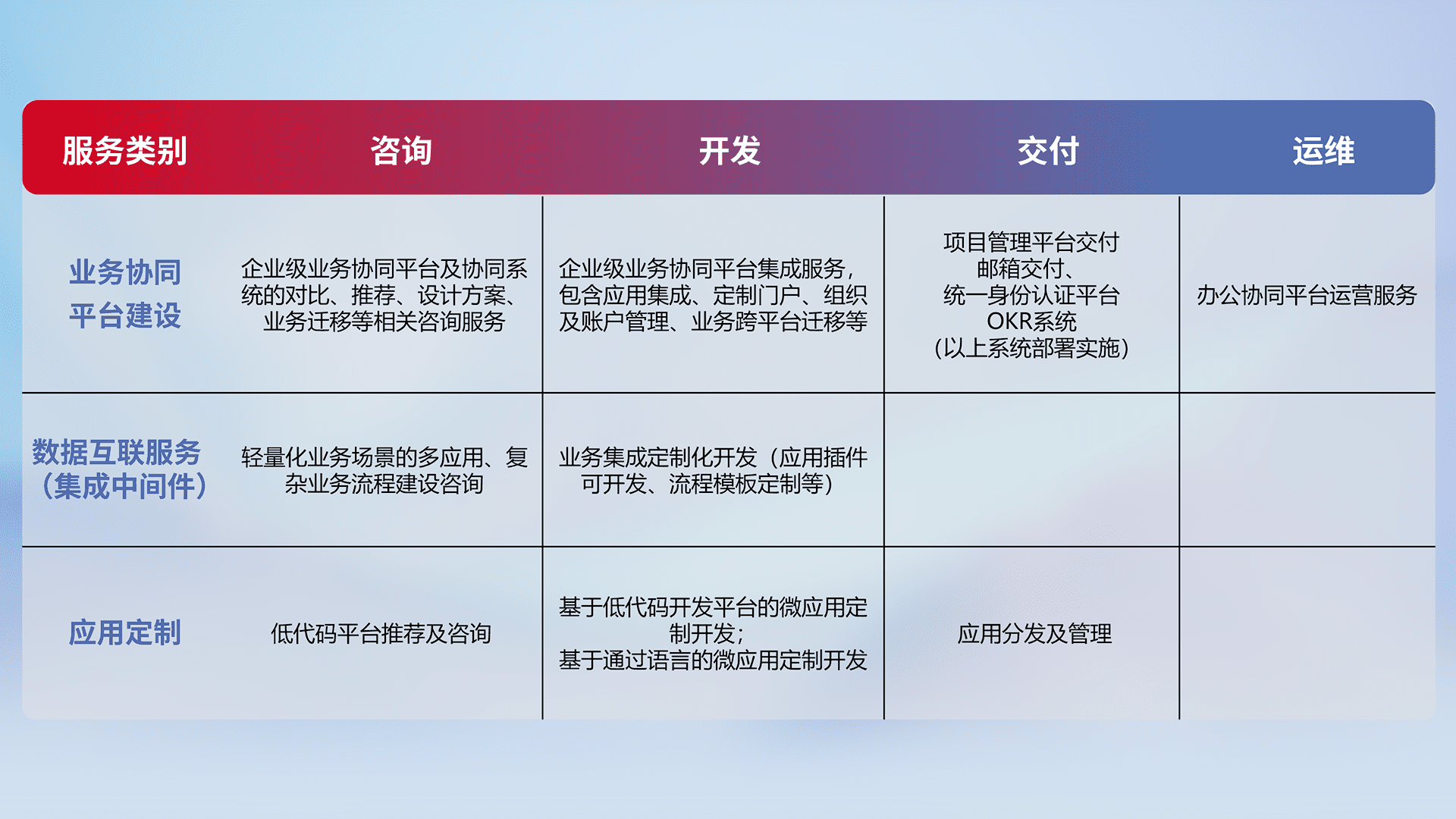 针对钉钉、、企微、、、IDaas等平台级产品提供产品的规划、、方案、、、交付、、定制化开发等服务,,,实现如统一协同办公、、、、智能客户服务、、、、混合会议管理、、、智能数据查询、、等业务场景,,,,实现数字化转型。。